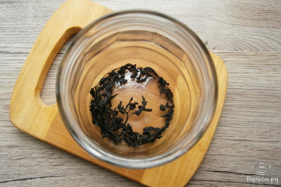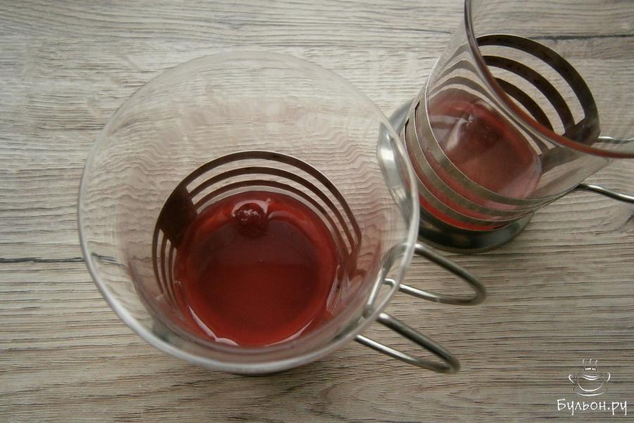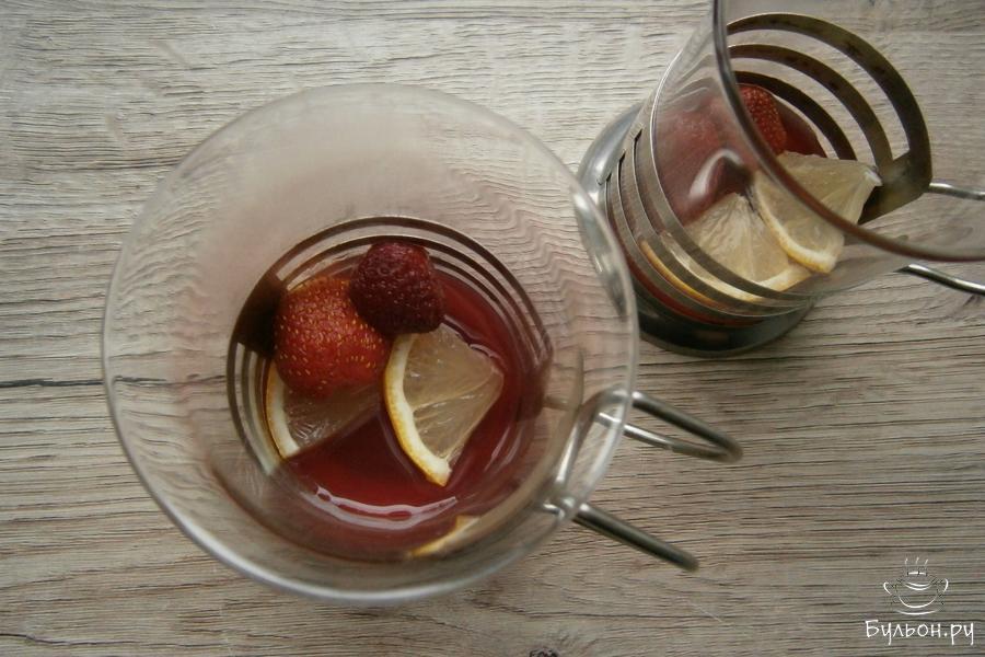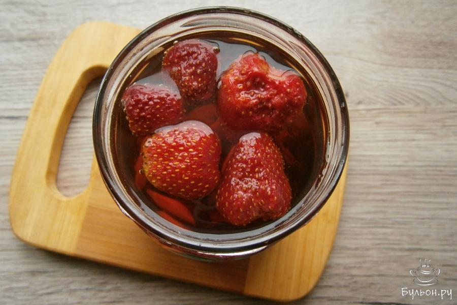 5. Сюда же, добавить свежие или свежемороженные ягоды клубники. Накрыть чай крышкой, а сверху еще и полотенцем, дать ему настояться 10 мин.
