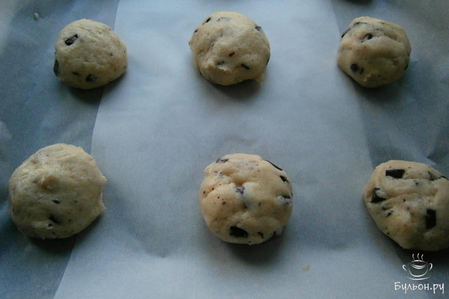 6. Чуть влажными или смазанными маслом руками скатать из теста шарики весом около 50-60 г, выложить их на застеленный бумагой пергаментной противень на довольно приличном расстоянии друг от друга - не менее 10 см.