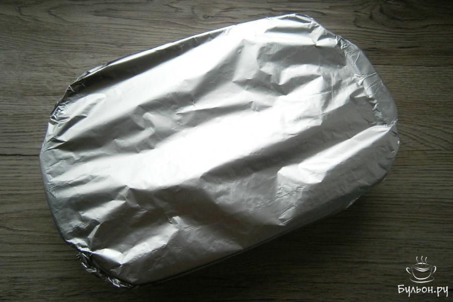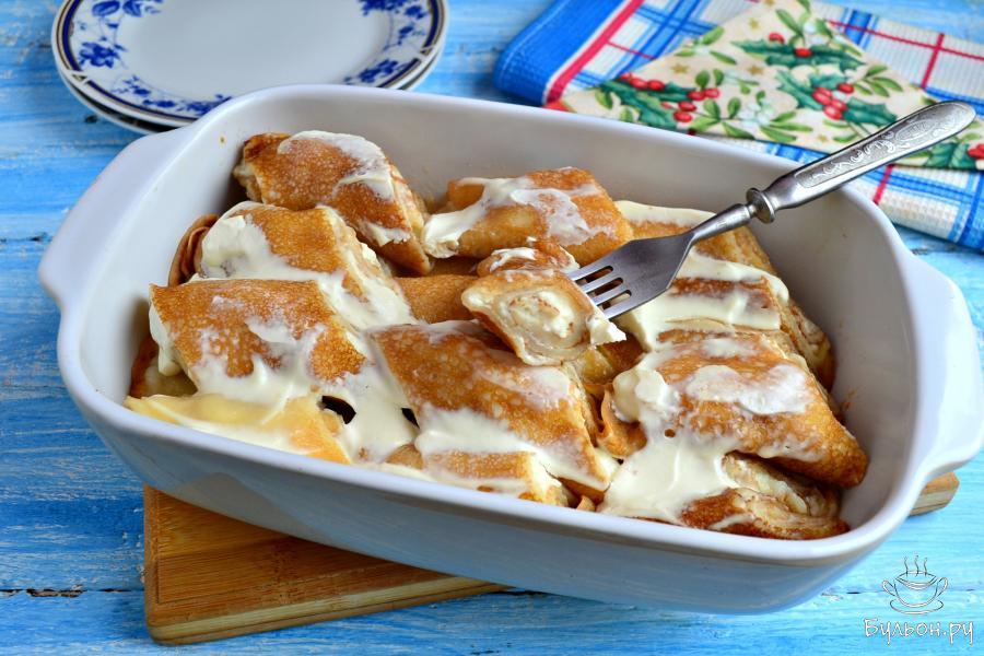 12. Запекать налистники около 1,5 часов при небольшой температуре духовки - 150-160 град. Готовые, горячие налистники смазать оставшейся сметаной, снова прикрыть форму фольгой и поставить их в уже выключенную, но еще горячую духовку минут на 20.