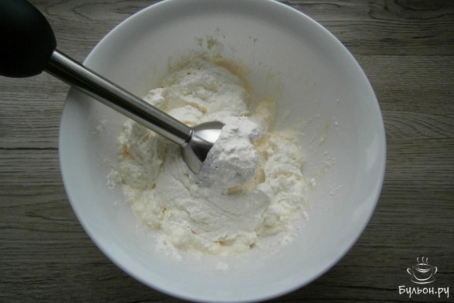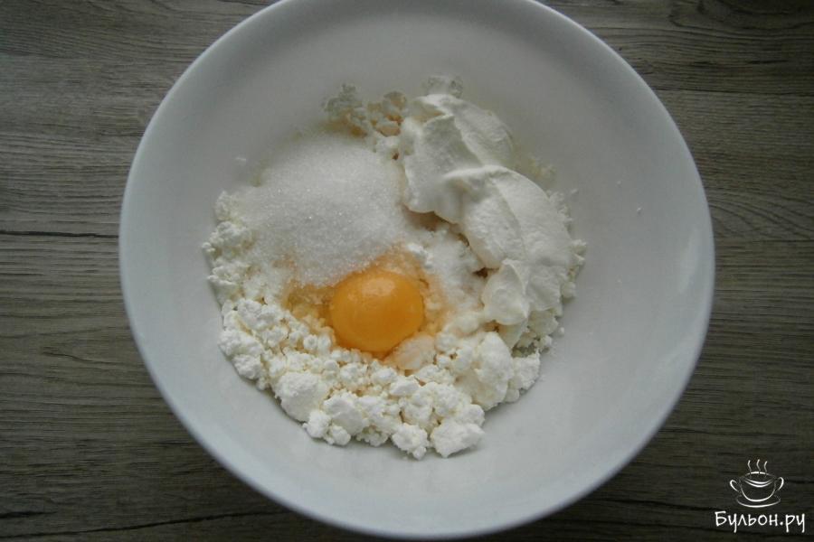 5. В это время приготовить начинку: к хорошему домашнему творогу добавить одно яйцо, 3 ложки сметаны, всыпать 3 ложки сахарного песка и сахар ванильный.