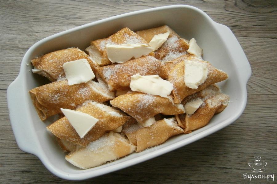 10. Затем, каждый блинчик с начинкой разрезать на 3 части и выложить в форму для запекания в один или два слоя. Каждый слой посыпать оставшимся сахаром и выложить кусочки масла сливочного.
