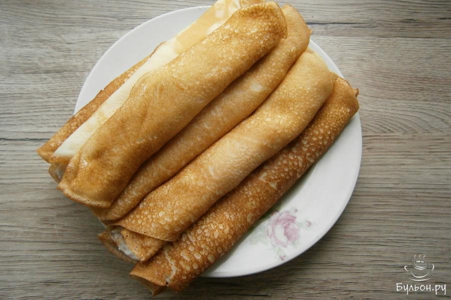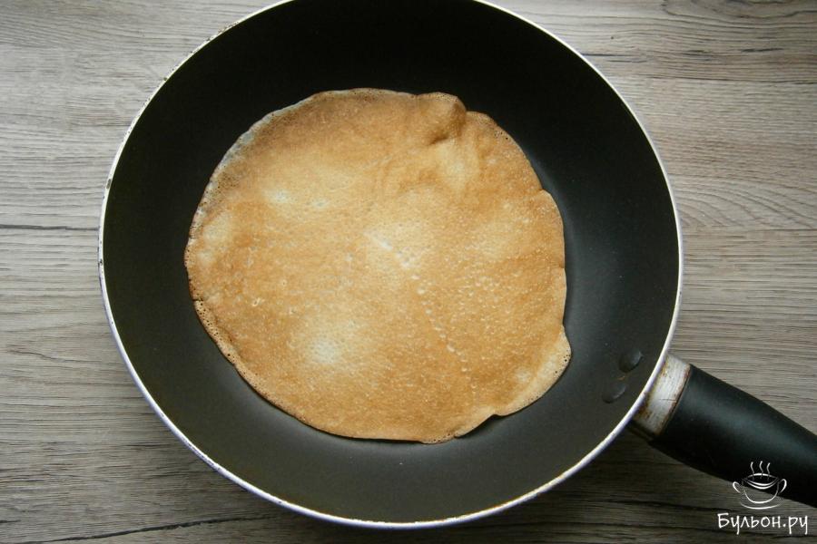 7. Из приготовленного теста, на сухой сковороде, пожарить блинчики обычным способом, дать им немного остыть.