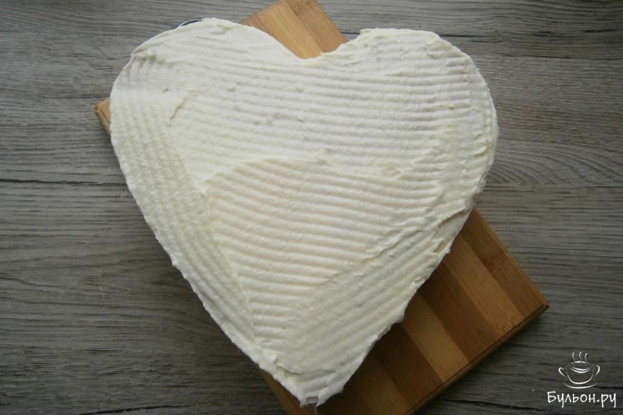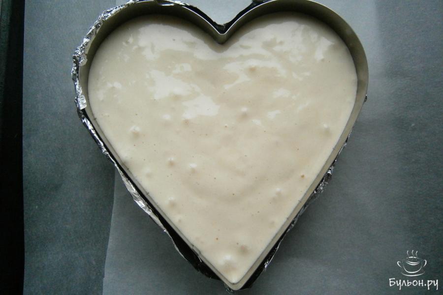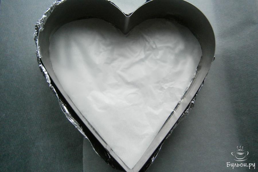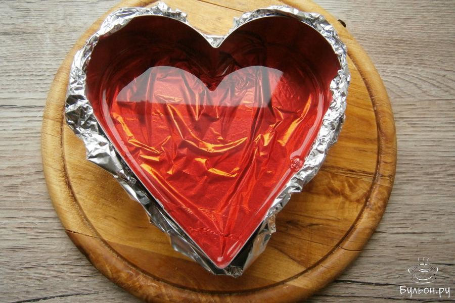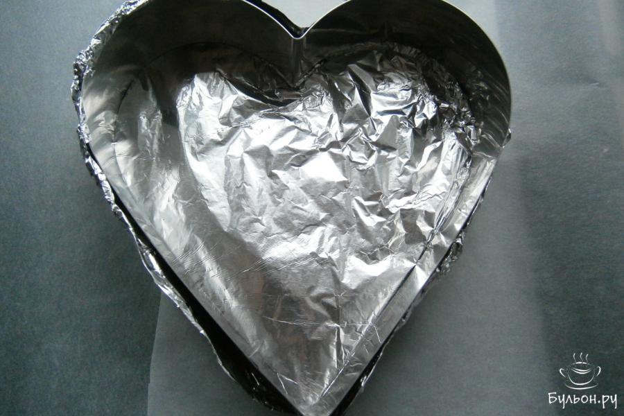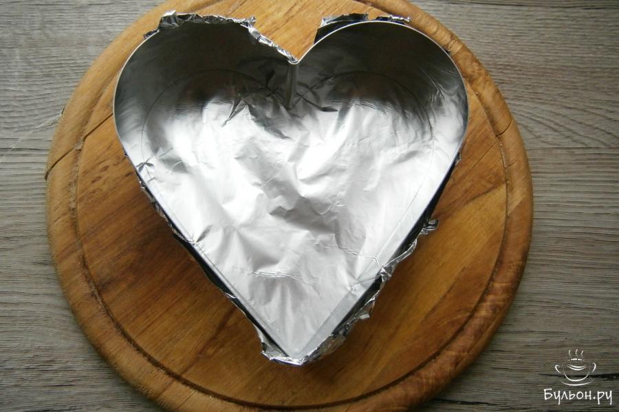 4. Форму в виде сердца диаметром приблизительно 22 см поместить на противень. Если формочка без дна, как на фото, затянуть его фольгой.