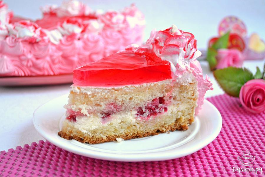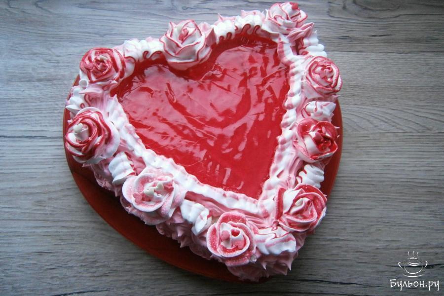 Ко Дню всех влюбленных, а также, для любого праздничного стола, предлагаю вам испечь необычайно вкусный, нежный, очень красивый тортик "Нежное сердце". Этот торт в форме сердца, украшенный розами и фруктовым или ягодным желе потрясающе выглядит, он обязательно покорит вашу вторую половинку и ваших гостей. Тортик получается небольшой - немного больше килограмма весом, очень вкусным и довольно легким, так, как в его составе, кроме прослойки масляного крема больше нет жира. Внутри я разместила еще и ягодки малины. Украшен торт белковым заварным кремом - легким и воздушным. Советую этот торт всем, он не оставит никого равнодушным.