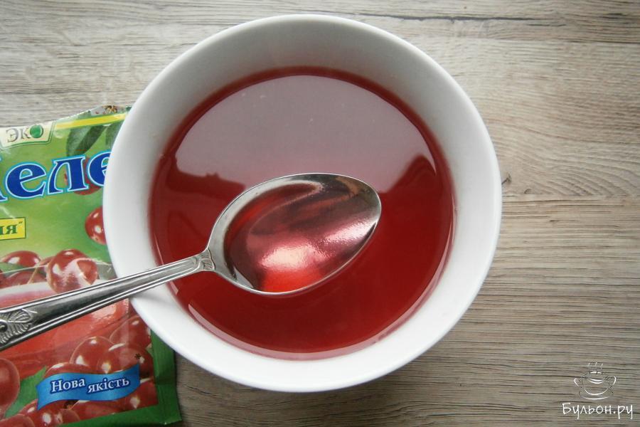 11. Пачку любого фруктового или ягодного желе, желательно, чтобы получилось красного цвета, развести по инструкции кипятком, только количество кипятка нужно уменьшить на 100 мл. Жидкое желе остудить.
