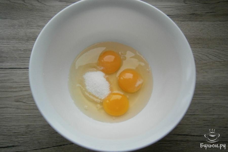 1. 3 сырых яйца разбить в миску, всыпать щепотку соли, 100 г сахарного песка и 1 ч. л. ванильного сахара.