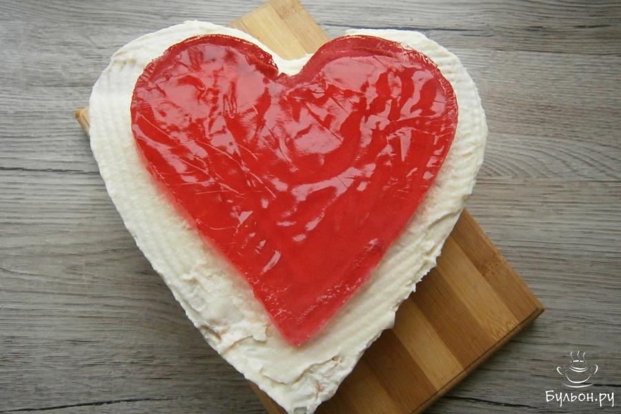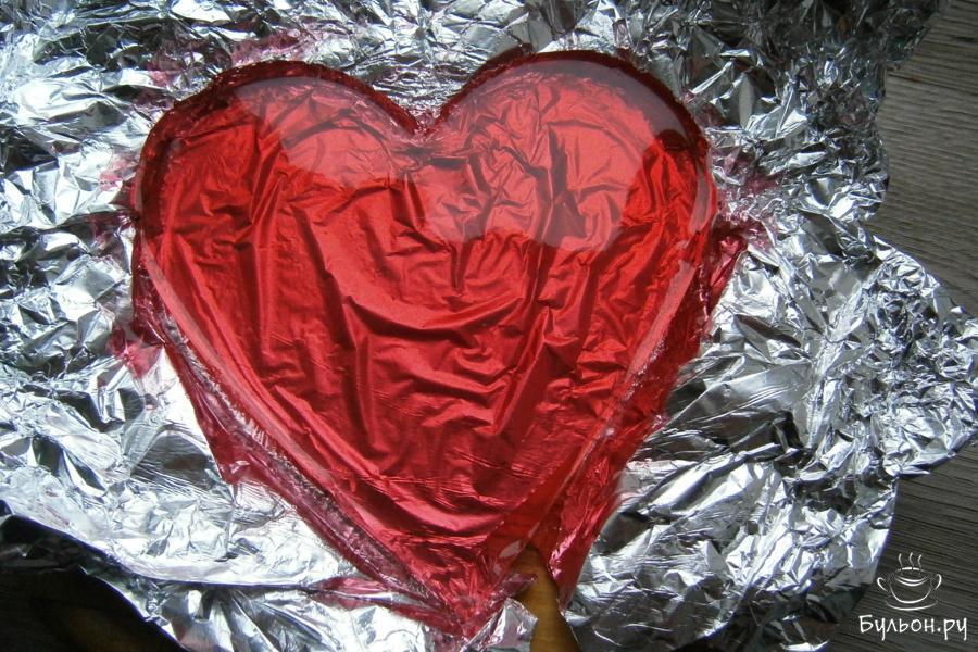 12. Формочку в виде сердца, только меньшего диаметра, чем для бисквита, снизу затянуть фольгой. Форму поместить на досочку.