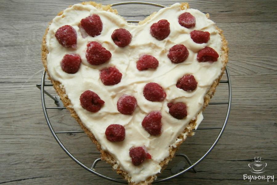 14. Нижнюю часть бисквита промазать половиной крема, выложить ягоды малины. Можете использовать и клубнику, вишню и т. д. Малина у меня была замороженной.