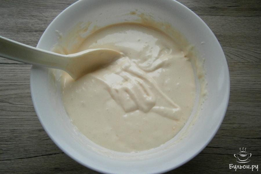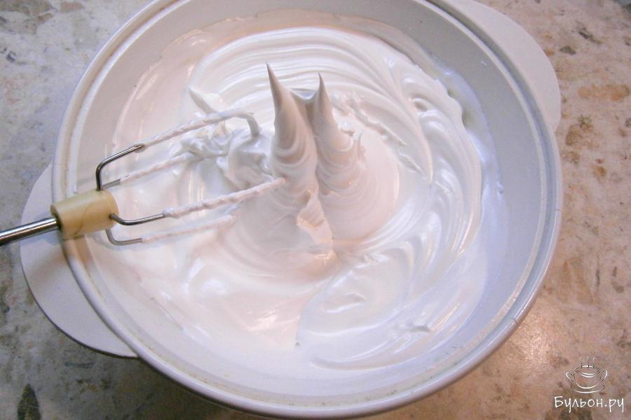 18. Для этого: разделить оставшиеся 3 яйца на белки и желтки. К белкам добавить 150 г сахарного песка, 1 ч. л. ванильного сахара и всыпать лимонную кислоту. Все миксером немного взбить. Поместить посуду с этой смесью на водяную баню и взбивать около 7-10 минут, снять с бани и взбивать еще минуты 2.