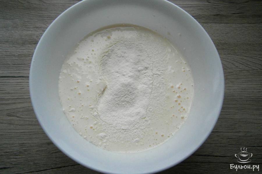 2. Все это взбить миксером на средней скорости до довольно пышной, светлой массы. Взбивать нужно минут 7-8. Затем, частями просеять прямо в эту массу муку и разрыхлитель, каждый раз все аккуратненько вмешивая.