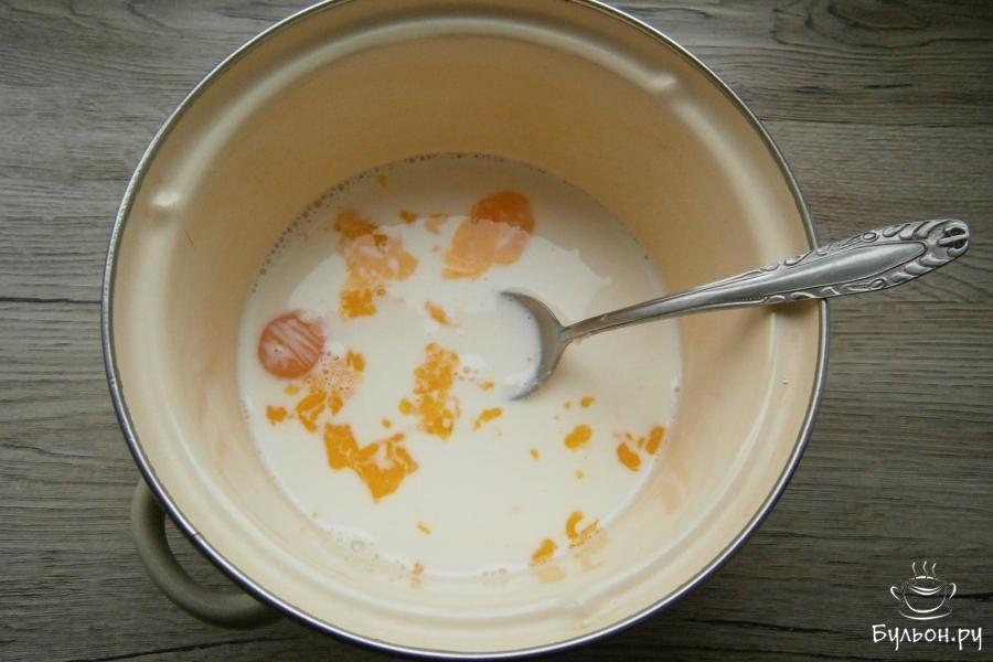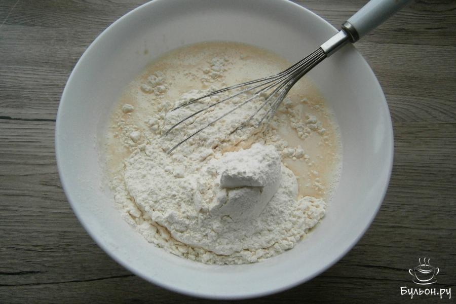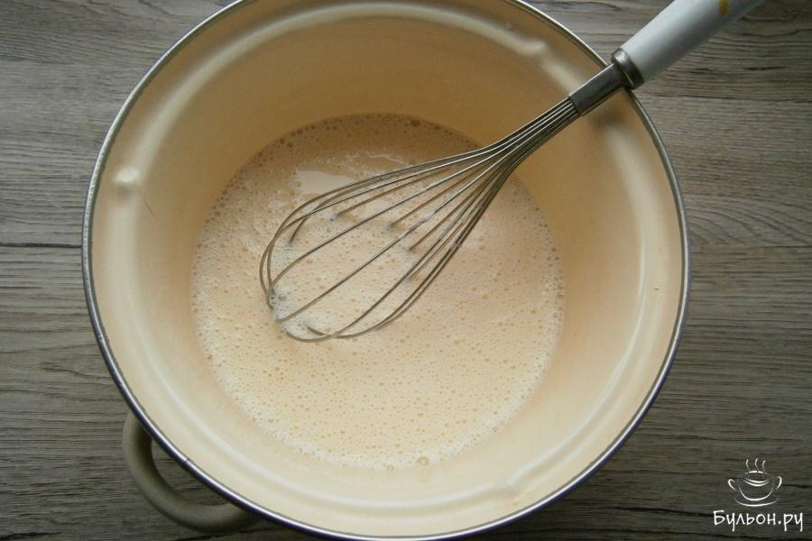 6. Все это взбить венчиком до однородности. Затем, смешать 60 г муки с небольшим количеством этой смеси, также, до однородности и вылить в кастрюлю, все перемешать.