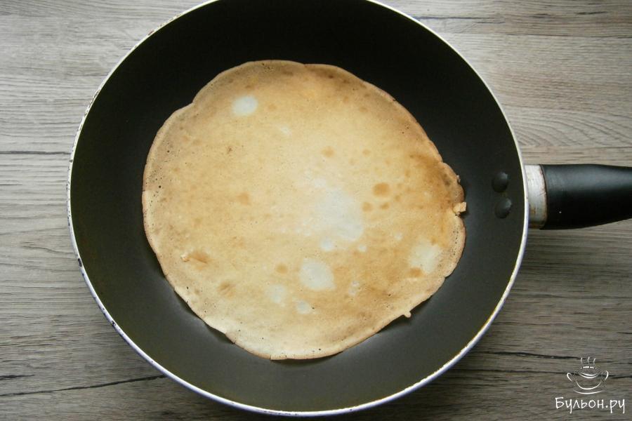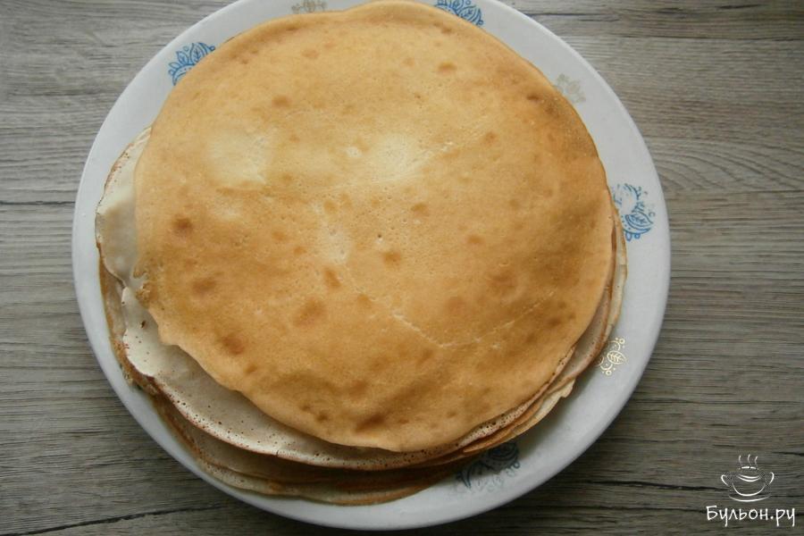 11. Далее, каждый блинчик смазать небольшим количеством крема. Должен получиться довольно объемный тортик.