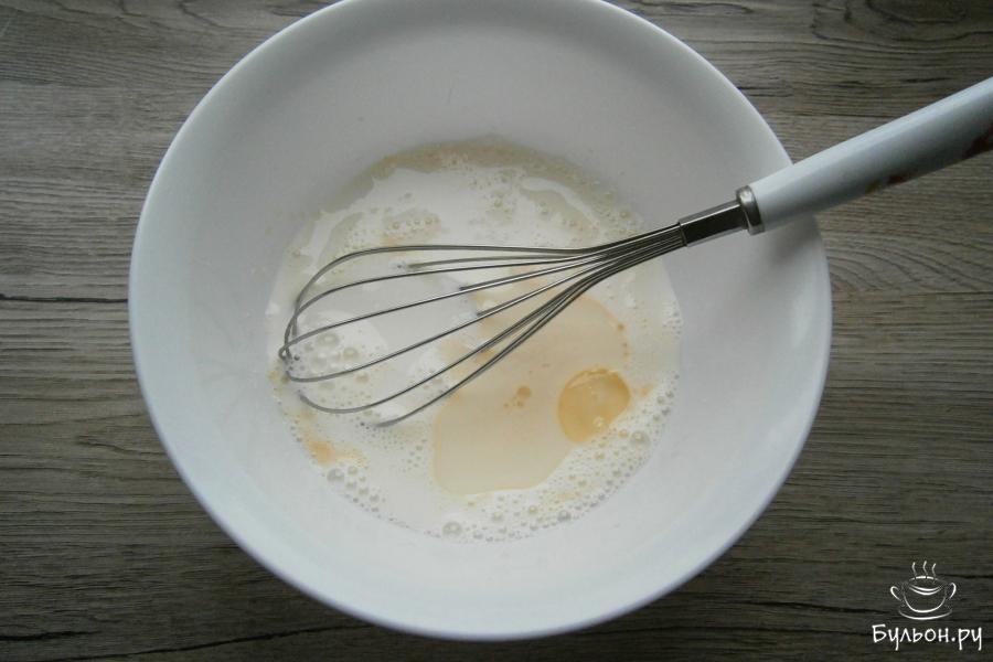4. Тщательно все взбить венчиком до однородного состояния. Тесто получится не слишком жидким. Оставить тесто на 15 мин.