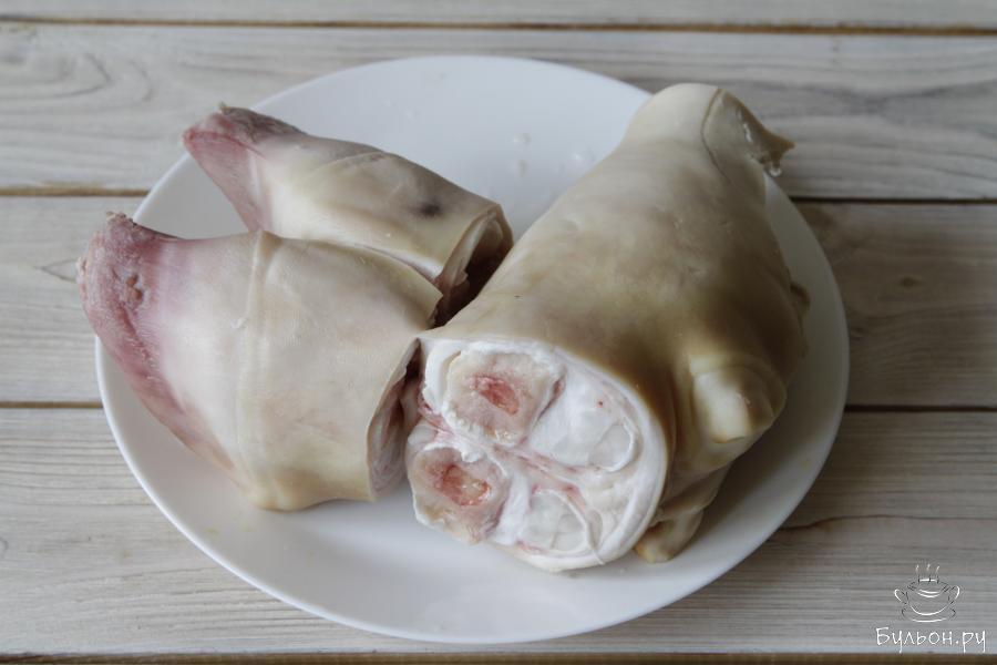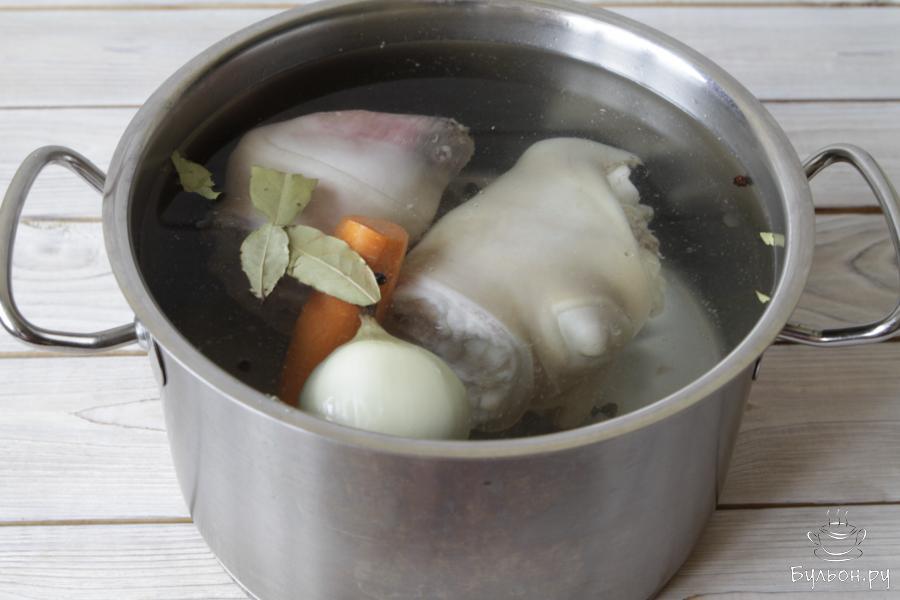 2. Уложить ножку в кастрюлю, наполнить ее водой, довести до кипения. Пенку снять, воду слить, ножку промыть. Вновь заполнить кастрюлю водой, уложить ножку. Довести до кипения. Добавить головку лука целиком, одну морковь, черный перец горошком, лавровый лист.
