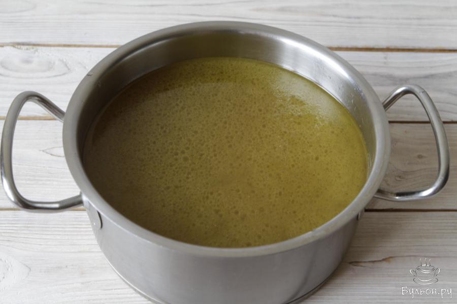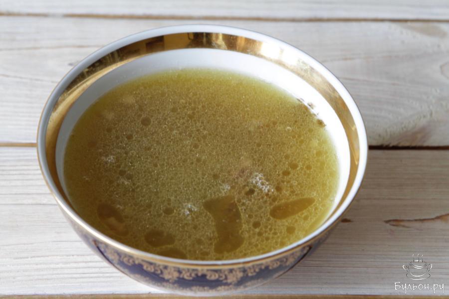 5. По истечении времени, когда ножка полностью разварится, кости отойдут от мякоти, аккуратно ее достать. Бульон процедить через два-три слоя марли, посолить.