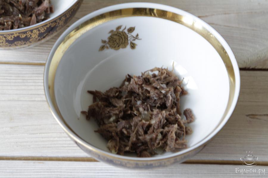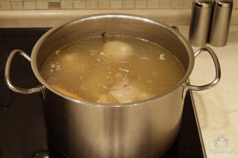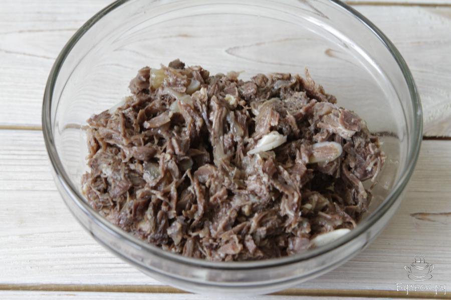 4. В отдельной кастрюле параллельно отварить кусок мяса до готовности. Остудить, разделать. Бульон вам не понадобиться, но его можно использовать для приготовления других блюд.