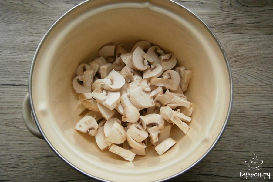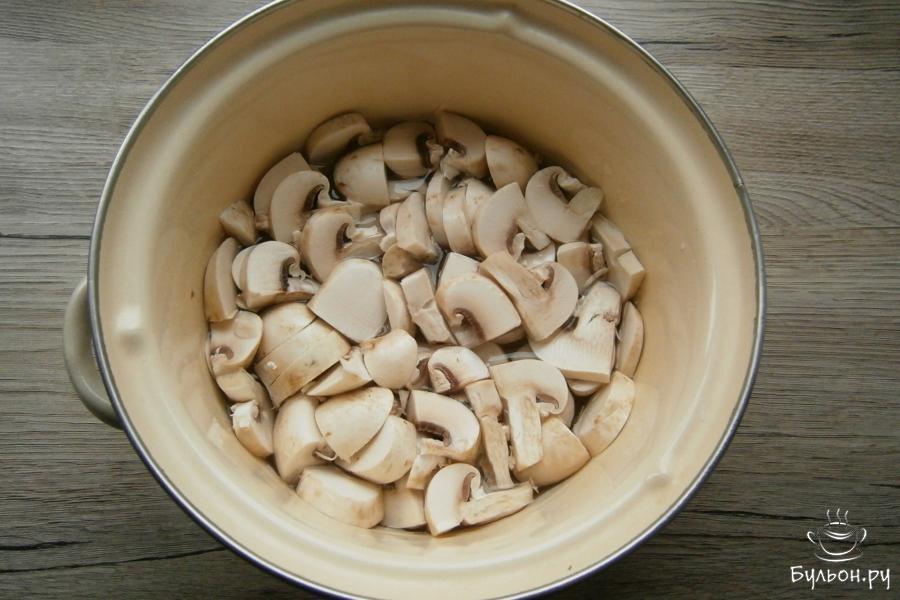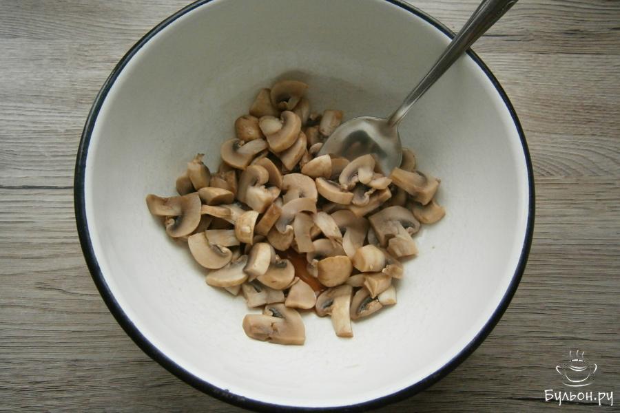 3. Отварить шампиньоны в течение 3 мин. после того, как закипит вода, далее, откинуть их на дуршлаг, затем, выложить в миску. Влить соус соевый - лучше с грибным вкусом, шампиньоны перемешать и дать им постоять пол часа.