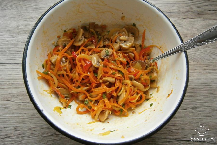 Салаты, приготовленные по-корейски пользуются популярностью, наверное, в каждой семье. Многие хозяйки научились готовить различные корейские салаты и радуют своих близких неповторимым их вкусом. Один из таких салатов готовится из шампиньонов и получается он необычайно вкусным, ароматным, чуть остреньким. Подать такой салатик можно к жареному мясу, как дополнение, к основному блюду, можно взять с собой на природу. Остроту салата регулируйте по своему вкусу.