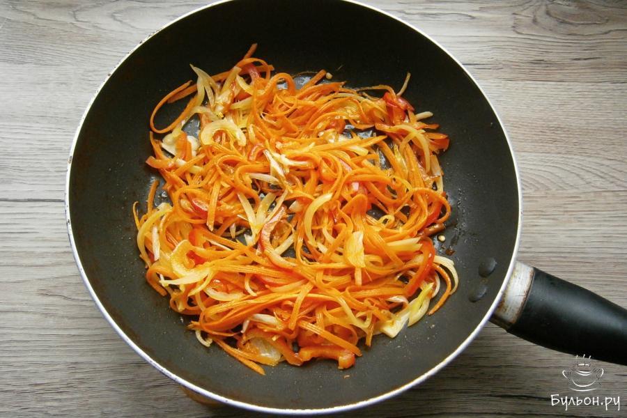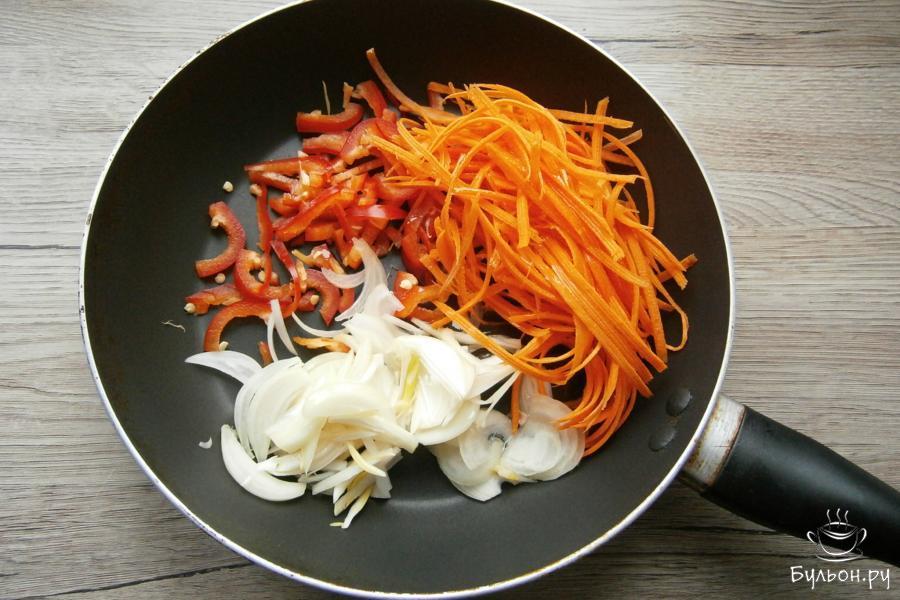 4. Морковку натереть или на специальной терке, или на обычной - крупной, репчатый острый лук порезать тоненькими полуколечками, перец болгарский порезать тонкой соломкой. Все овощи выложить в сковороду с рафинированным растительного происхождения маслом.