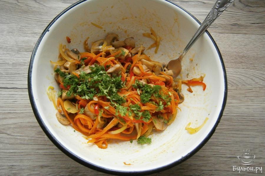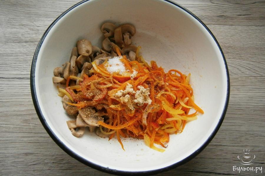 6. Овощи выложить к шампиньонам, добавить сахарный песок, перец черный и молотый чили, соль, кориандр, влить уксус столовый и добавить пару зубков измельченного чеснока.