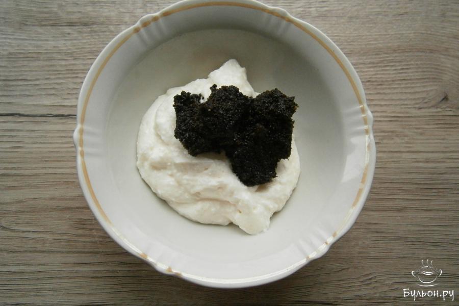 7. Мак промыть, смешать его с медом. Во вторую часть творожной начинки добавить половину маковой смеси, все перемешать.
