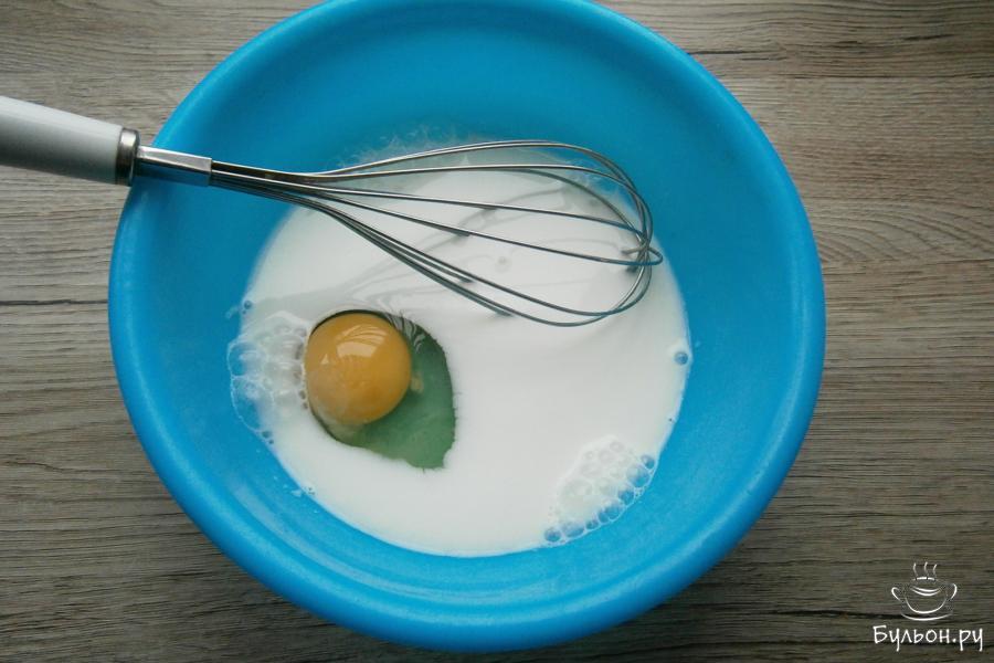 1. Молоко налить в миску, добавить соль, 1 ч. л. сахарного песка, сырое яйцо и соду. Все тщательно расколотить венчиком.