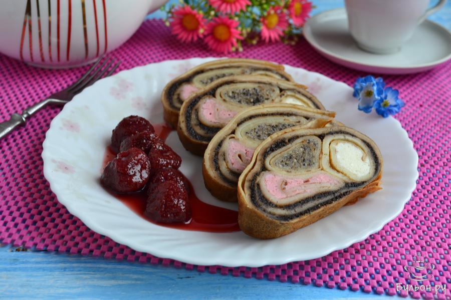 Если вы любите блины и хотите что-нибудь необычного, предлагаю приготовить замечательный блинный рулет с тремя разными начинками. Рулет готовится не сложно и получается необычайно вкусным и эффектным. Таким рулетом можно угостить друзей и знакомых на Масленицу или приготовить своим родным. Начинка готовится из творога, который делится на 3 части, в одну из которых я добавила мак, в другую - клубнику, а третью оставила такой, как есть. Можете экспериментировать и добавлять в творог, например, киви, малину, сухофрукты и т. д. Рулет не разваливается, режется ровно и выглядит необычно и красиво. Попробуйте.