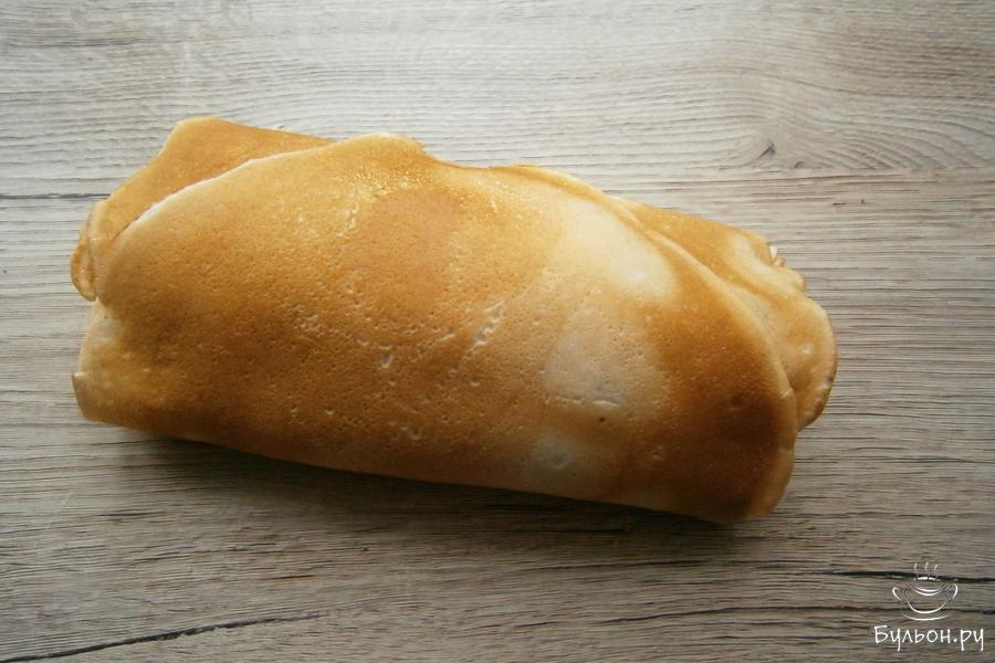 14. Переложить блинный рулет на лист фольг, сложенный вдвое, завернуть, края фольги закрутить. Поместить рулет в форму для запекания или на противень.