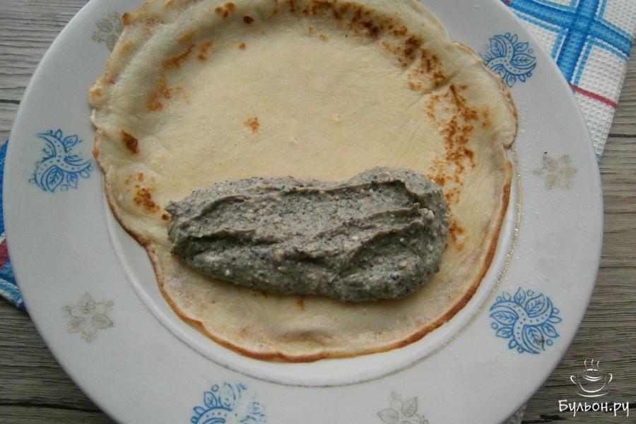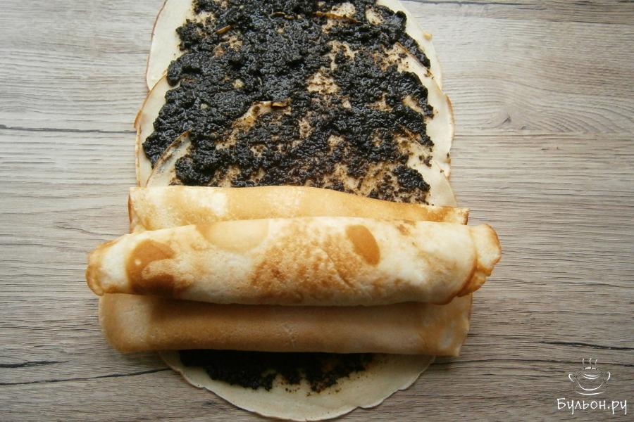 12. На третий блинчик выложить оставшуюся белую творожную массу. Все блины свернуть в рулеты. Оставшиеся три блина разложить внахлест друг к другу и смазать оставшейся маковой смесью с медом. На краю разместить 3 блина с разными начинками: два вместе и третий - сверху.