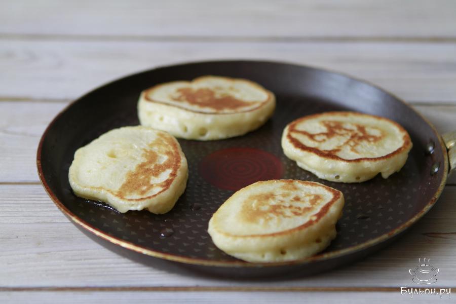 6. Сковороду разогреть, смазать растительным маслом. Столовой ложкой выложить тесто на сковороду. Выпекать оладушки с двух сторон до румяной золотистой корочки.