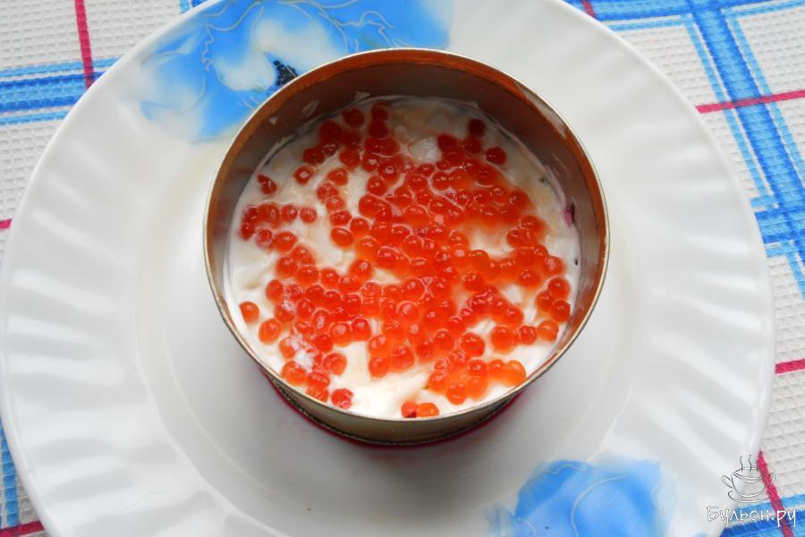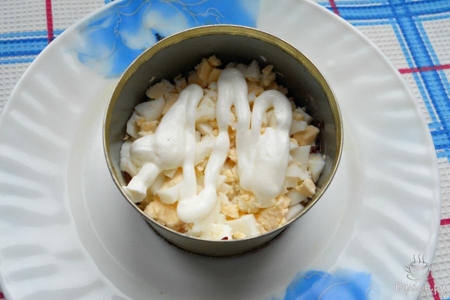 3. Яйца отварить, залить холодной водой, дать остыть. Очистить яйца и мелко порубить ножом или натереть на крупной терке. Половину яиц разместить вторым слоем салата, посолить немного, смазать сметаной.