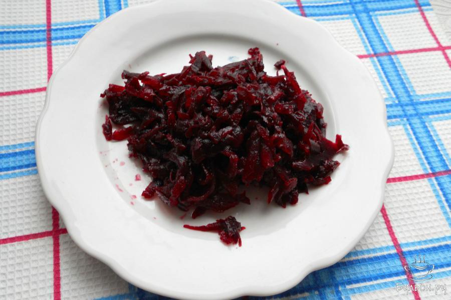 1. Свеклу отварить, остудить, очистить и натереть на крупной терке. Если свекла оказалась слишком сочной, ее нужно отжать, чтобы не потекла в салате.