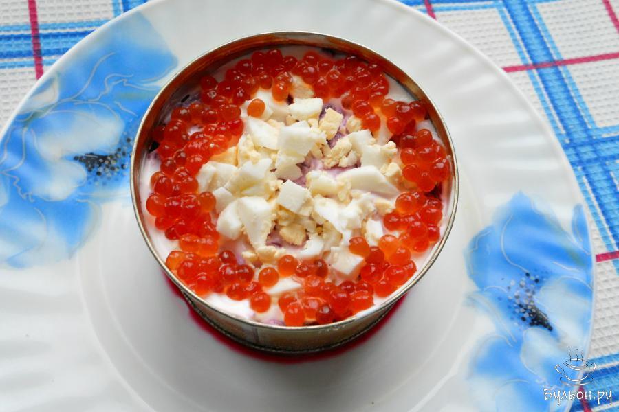 Салат со свеклой, яйцом и красной икрой - простой по составу, но очень вкусный салатик, который украсит любой праздничный стол. Салат готовится слоями со сметаной, получается легким и нежным. Такой салат больше придется по вкусу женской половине и подать его можно как в одном салатнике, так и порционно - оформив салат с помощью кулинарного кольца.