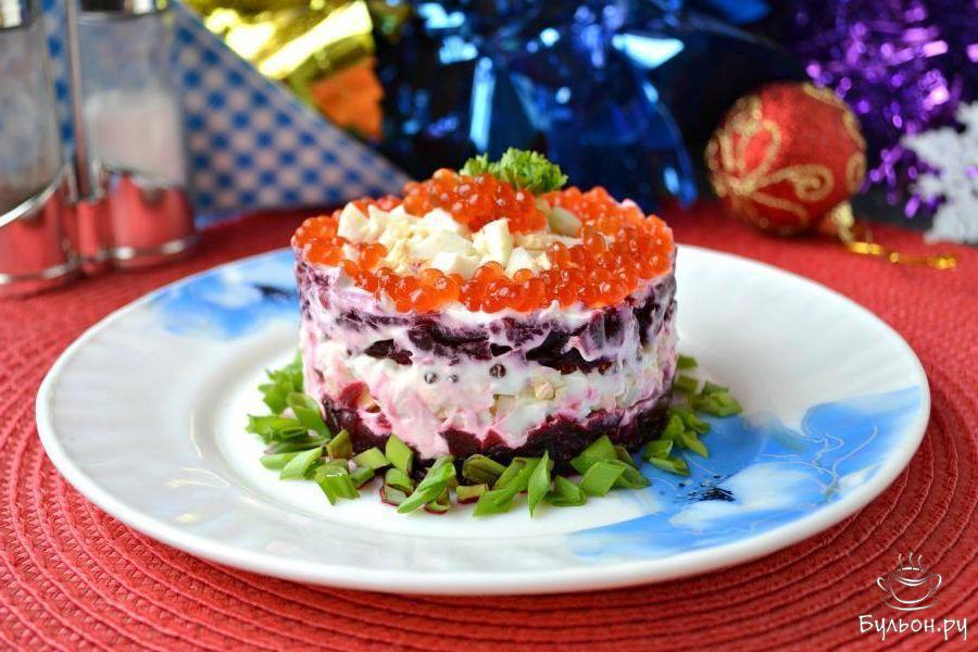 6. Украсить салат веточкой петрушки и измельченным зеленым луком. Салат со свеклой, яйцом и красной икрой сразу же подать к праздничному столу. Приятного аппетита.
