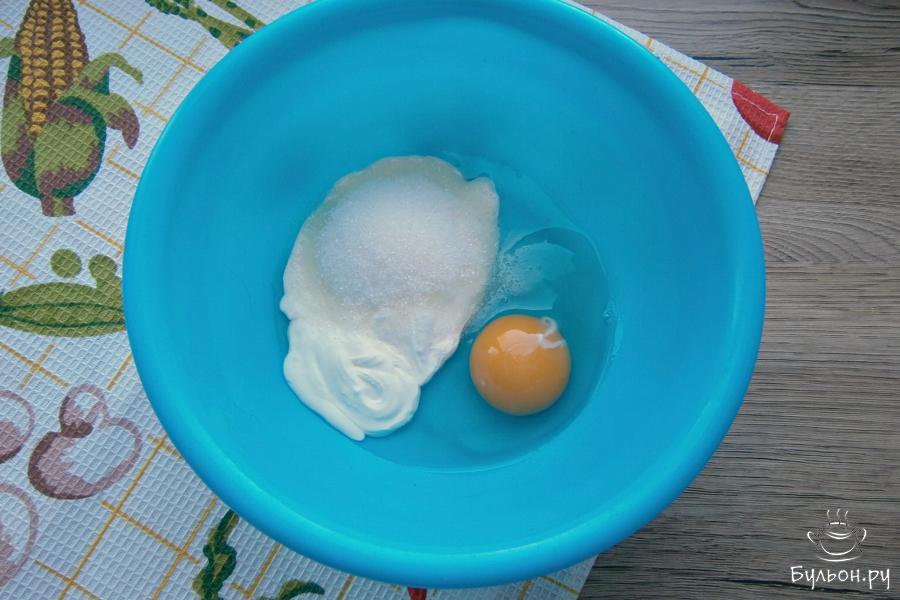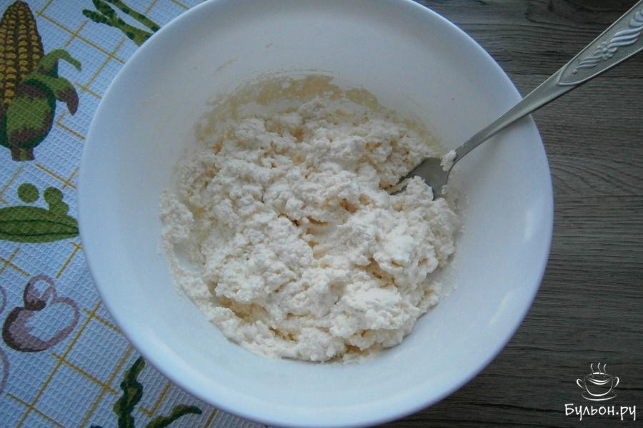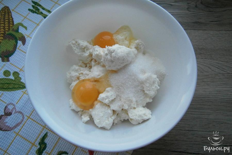 5. Для начинки: в творог, желательно жирненький, добавить два сырых яйца, всыпать 3 ст. л. сахара и немного ванилина.