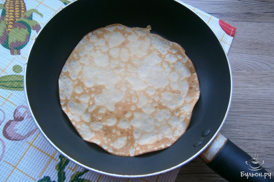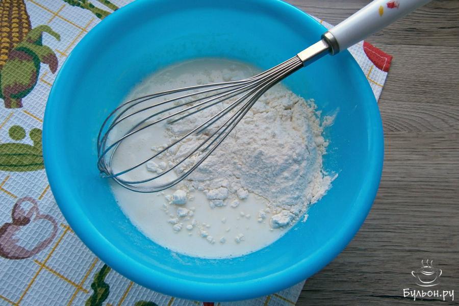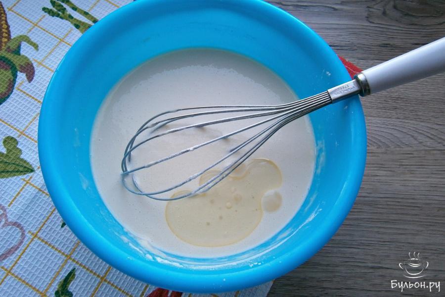 3. Замесить венчиком блинное, не слишком жидкое тесто, добавить в него 2 ст. л. растительного масла. Перемешать.
