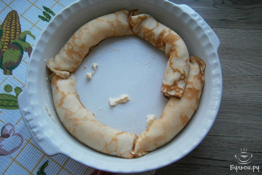8. Блины сворачивать трубочкой и выкладывать в смазанную маслом круглую форму для запекания спиралью.