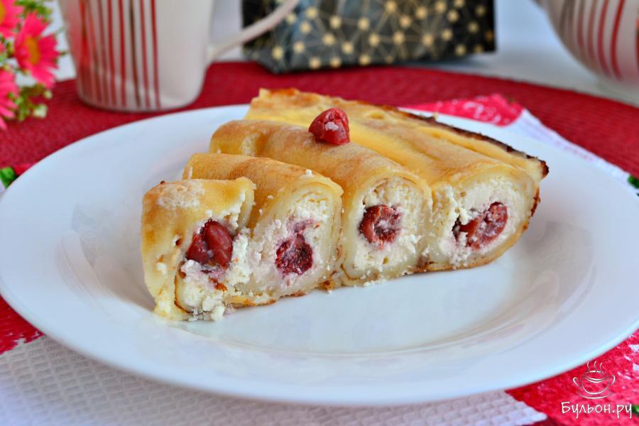 Скоро Масленица и многие хозяйки хотели бы приготовить не банальные блины, а что-то интересное и необычное, что-то такое, чтобы можно было удивить и близких, и гостей. Один из таких рецептов я вам и предлагаю. Готовится все просто, казалось бы, обычные блины с творожной начинкой, но запеченные в виде пирога, они делают блюдо праздничным и необычным. Этот пирог из блинов, сложенных в виде спирали, с начинкой из творога и вишни необычайно вкусный и нежный. Он сладкий, а вишня придает пирогу приятную кислинку. Приготовьте блинный пирог, ваши близкие будут сыты и довольны.
