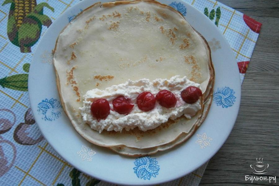 7. На край каждого блина выкладывать по 2 ст. ложки творога, на него - по несколько ягод вишни без косточек. Вишню можно использовать и замороженную, и свежую, и консервированную из компотов.