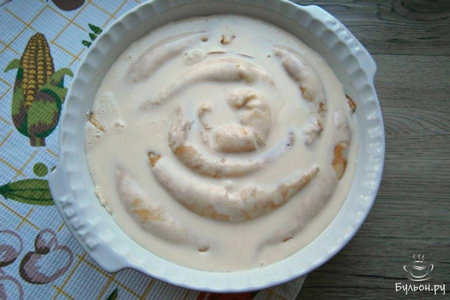 10. Приготовить заливку: взбить венчиком два яйца с 5 ст. ложками сметаны и 3 ст. ложками сахарного песка - до однородности. Залить этой смесью блины.