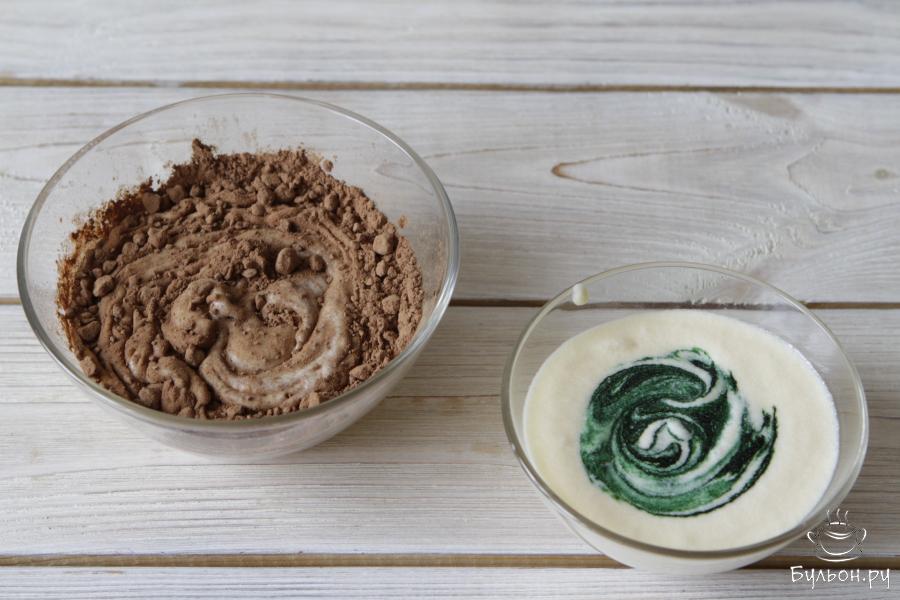 4. Для того чтобы кексы соответствовали камуфляжной расцветки тесно необходимо разделить на три равные части. В одну добавить какао-порошок, во вторую часть пищевой краситель. У меня он зеленого цвета. Тщательно все перемешать.