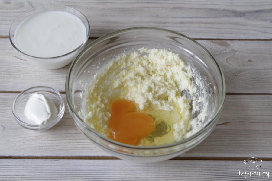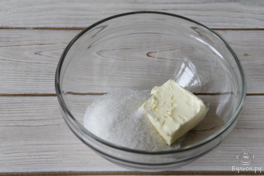 1. За пол часа до приготовления достать все необходимые ингредиенты из холодильника и включить духовку для разогрева. В чашу переложить мягкое сливочное масло и взбить его с сахаром.