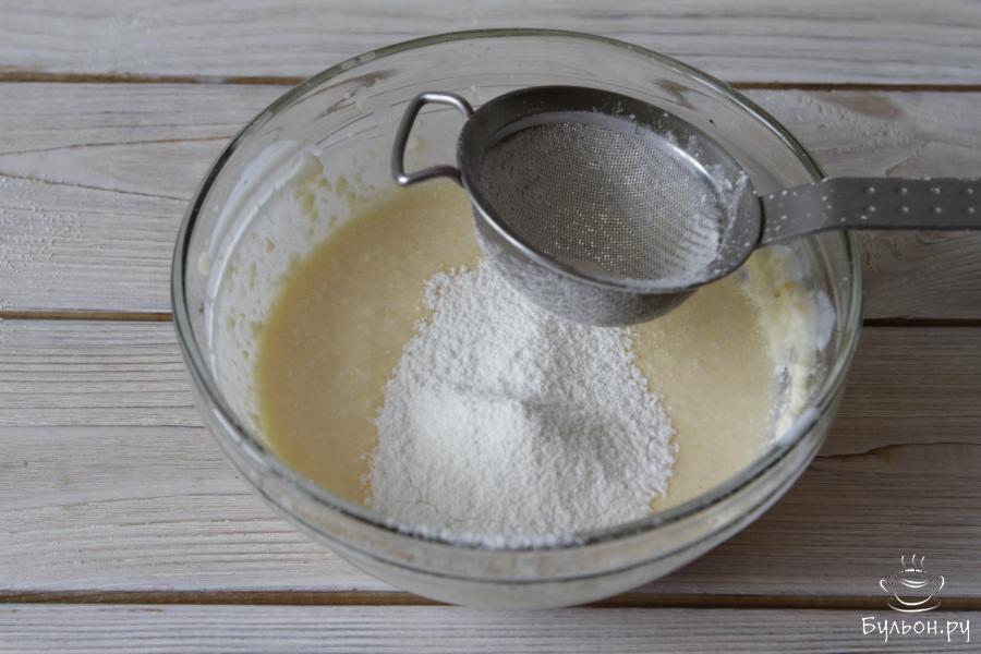3. Взбить все ингредиенты миксером до однородной массы. Муку просеять и ввести в чашу с разрыхлителем к остальным ингредиентам. Замесить тесто.