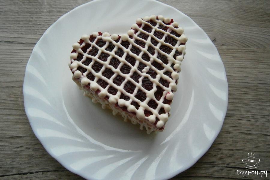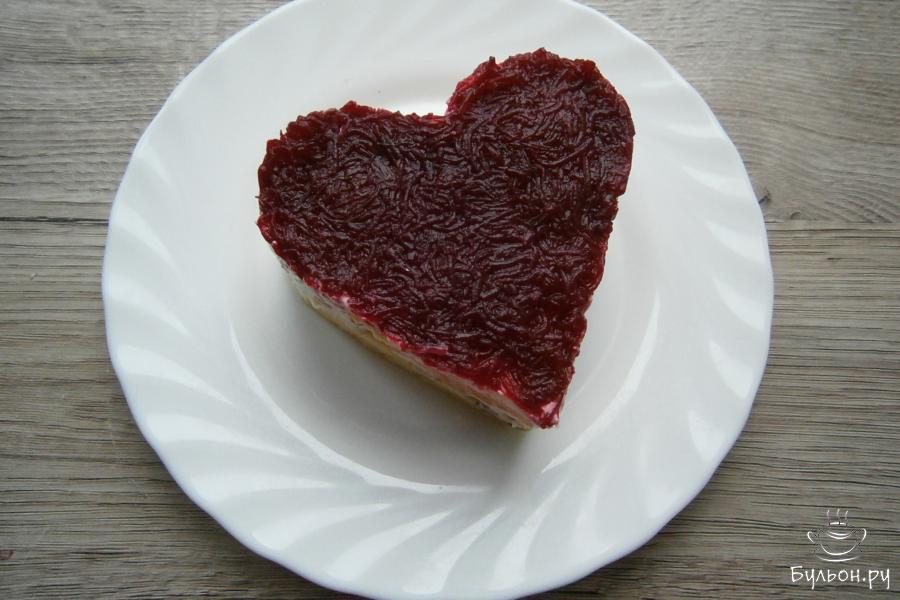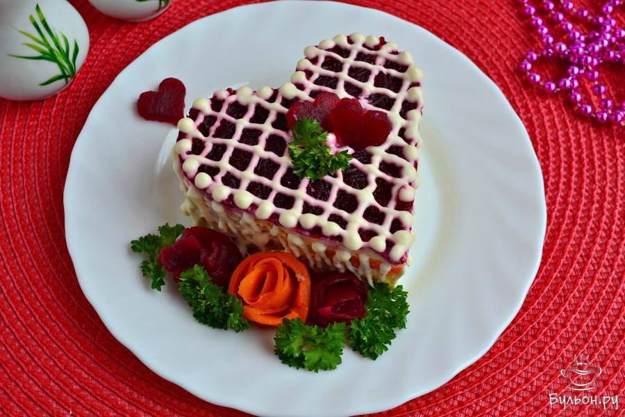 Красивый и яркий салат в виде сердца "Для любимого" - это салатик, который обязательно нужно приготовить на День всех влюбленных для своей второй половинки. Салат смотрится эффектно, не смотря на самые обычные продукты, к тому же, он еще и очень вкусный. Приготовить этот салат не составит большого труда, нужно иметь кулинарное кольцо или формочку в виде сердечка или же, аккуратно выкладывать ингредиенты в форме сердца. Украшается салатик сеточкой из майонеза и красивыми розами из свеклы и моркови.