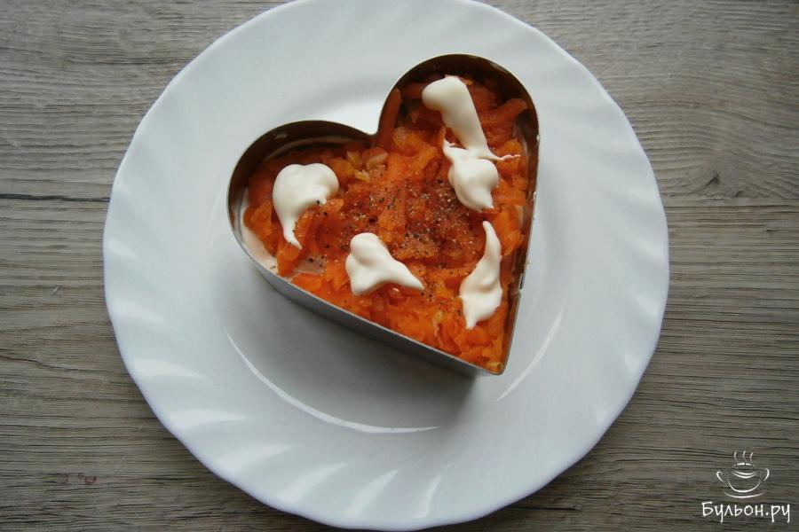 5. Далее выложить слой вареной моркови - натертой, с майонезом, немного все поперчить. Часть моркови нужно оставить для украшения.