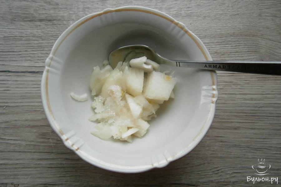 1. Предварительно отварить любую часть курицы, а также, свеклу, картошку и морковку. Все остудить, овощи очистить, курицу отделить от костей, если имеются. Лук порезать тонкими кусочками, добавить к нему воду, уксус и сахарный песок. Лук перемешать тщательно и дать ему промариноваться минут 20.