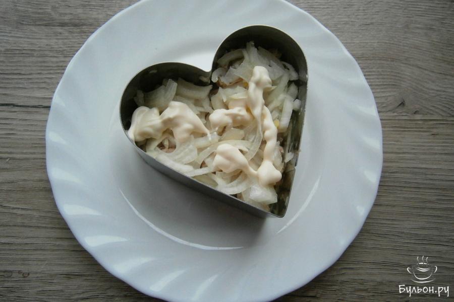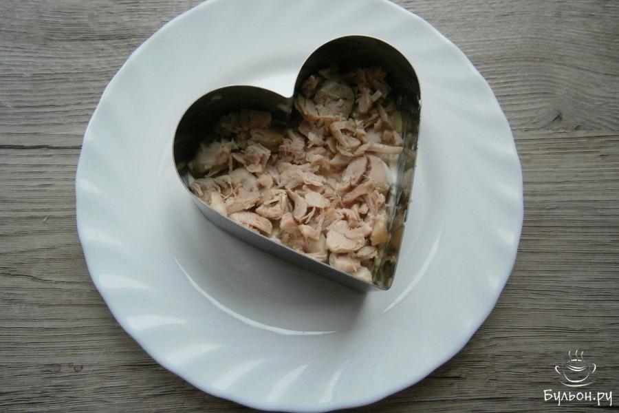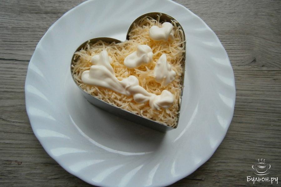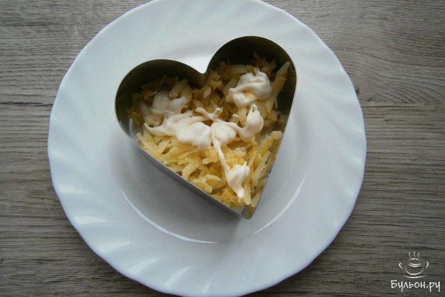 2. С помощью специального кольца в виде сердца салат выкладывать на мелкую тарелку слоями. Нижним слоем выложить тертый картофель, который чуточку посолить и промазать майонезом.