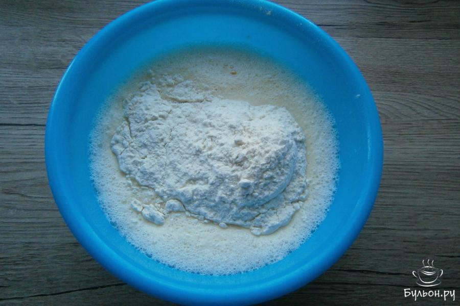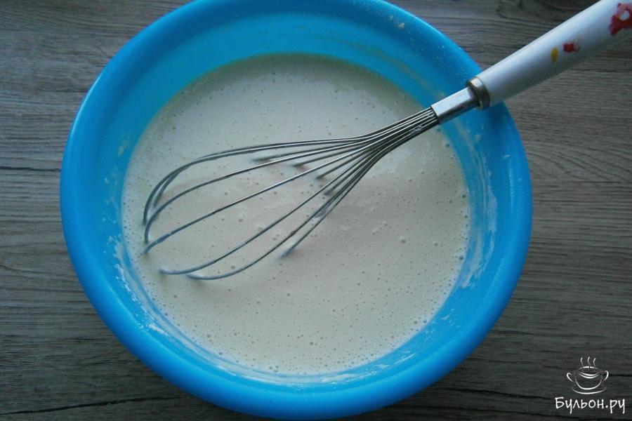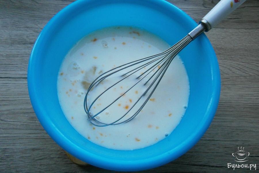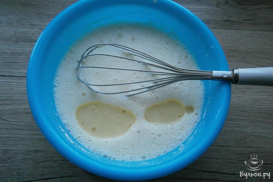 6. Пока гречка с курицей остывает, приготовить тесто для блинов. Молоко смешать венчиком с яйцом, добавить 1/2 чайную ложку соли, всыпать сахар.