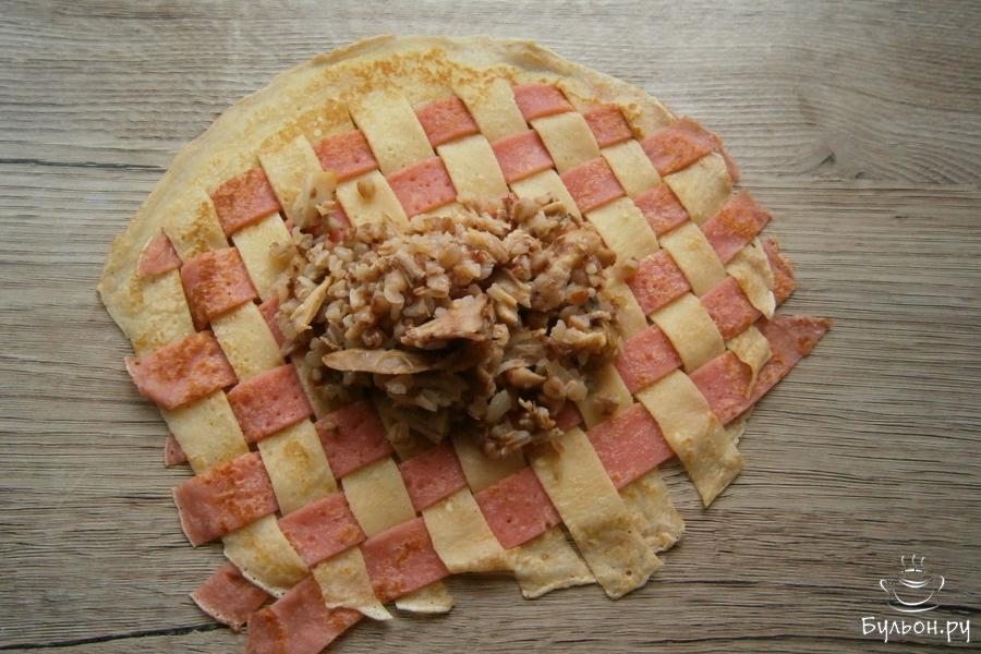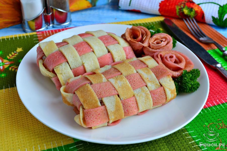 Предлагаю вам рецепт необычных блинов с начинкой, которые не просто нужно пожарить, а еще и сплести. Готовятся блины разного цвета, у меня - обычные светлые и свекольные розовые, внутри - начинка из гречневой каши и отварной курицы. Блинчики получаются очень вкусными, красивыми, необычными и эффектными. Их отлично подать к праздничному столу на Масленицу и удивить своих гостей. Попробуйте, плетение блинов работа, конечно, кропотливая, но не трудная, а результат - потрясающий.
