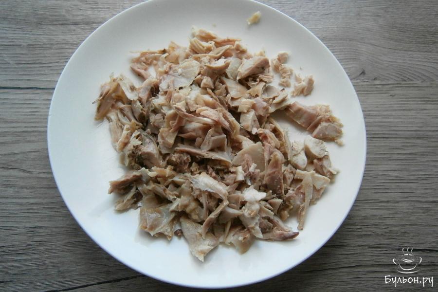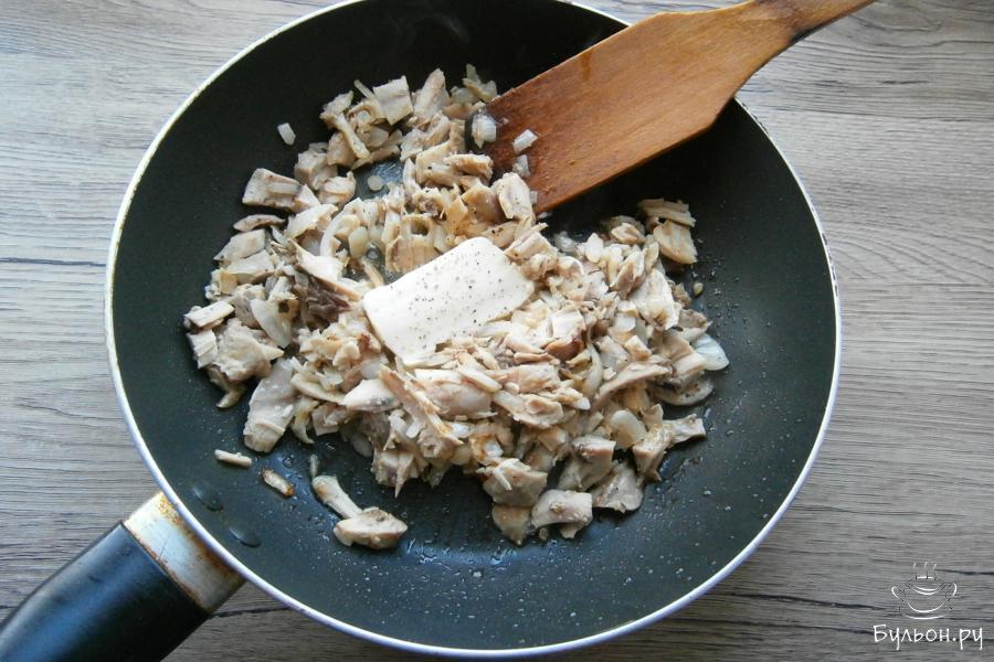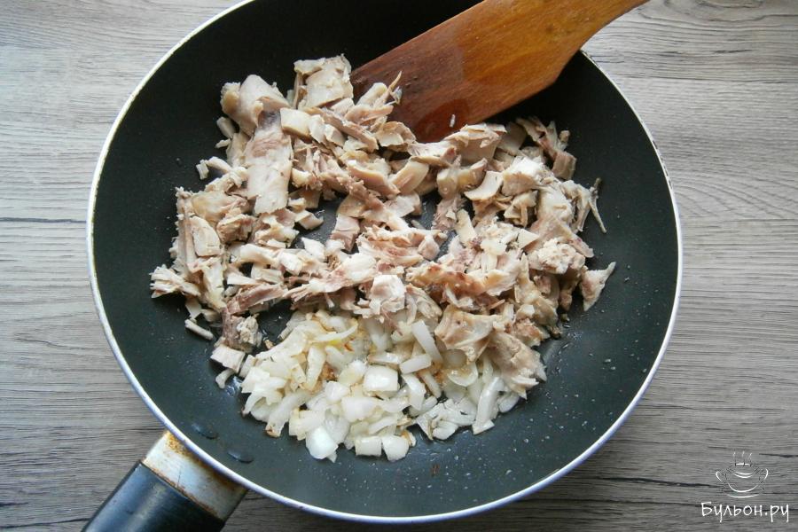 3. Лук репчатый порезать произвольно, обжарить его, добавив в сковороду 2 ст. ложки растительного масла. Далее, добавить к луку мясо курицы, обжарить все вместе несколько минут.